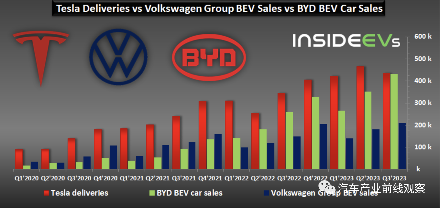 特斯拉vs比亚迪vs大众集团BEV汽车销售-2023年第三季度