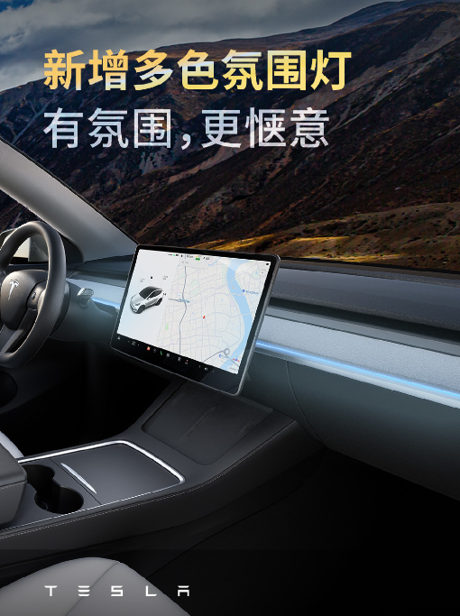 事实上,全新Model Y算是小改款车型,新增多色氛围灯、采用科技纺织材料的全新仪表台饰板、19英寸双子星轮毂。另外,全新Model Y后轮驱动版百公里加速时间为5.9秒,相比老款缩短了1秒。