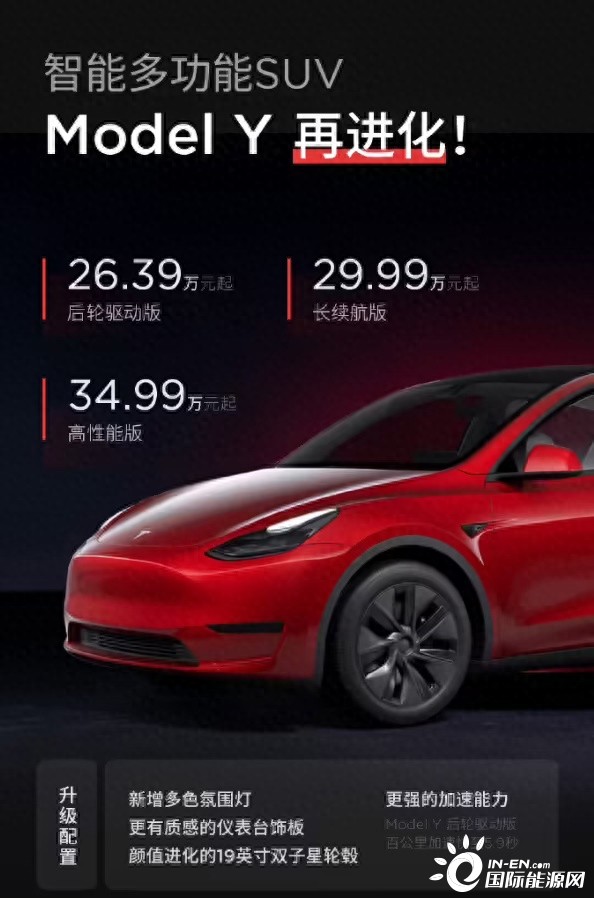 10月1日,特斯拉宣布Model Y汽车迎来升级,新增多色氛围灯、全新仪表台饰板等,百公里加速提升至5.9秒,而且依然维持在26.39万元。