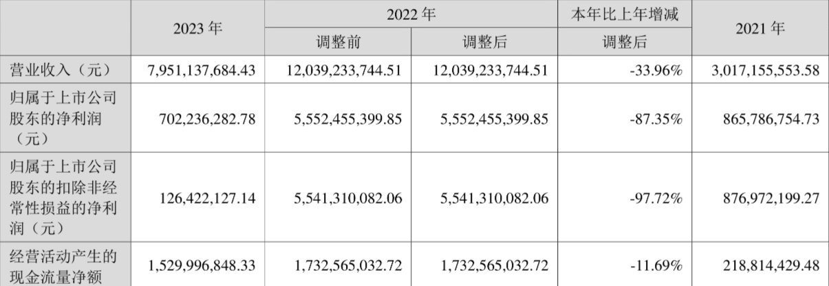 国际能源网获悉,3月28日,盛新锂能披露2023年年报。2023年,公司实现营业收入79.51亿元,同比下降33.96%;实现归属于上市公司股东的净利润7.02亿元,同比下降87.35%。
