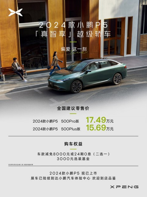 9月25日,继2024款小鹏G9问世仅一周,小鹏汽车再度发力新产品,2024款小鹏P5正式上市,全系共推出2款配置车型,售价区间15.69-17.49万元。用户购车可享车款减免8000元或24期0息(二选一)、3000元选装基金等多项重磅购车权益。
