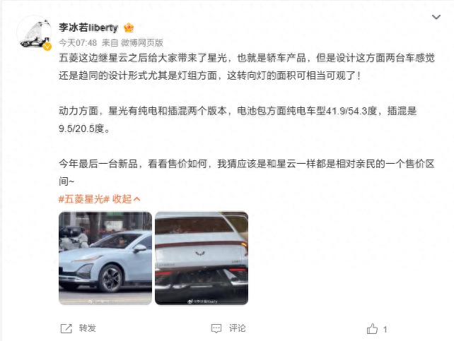 9 月 23 日,这两天微博多名汽车博主晒出了五菱品牌最新轿车产品 —— 五菱星光的实车图。从外观上看,此次亮相的车型为纯电版本,身披淡蓝色车漆且并没有覆盖伪装。