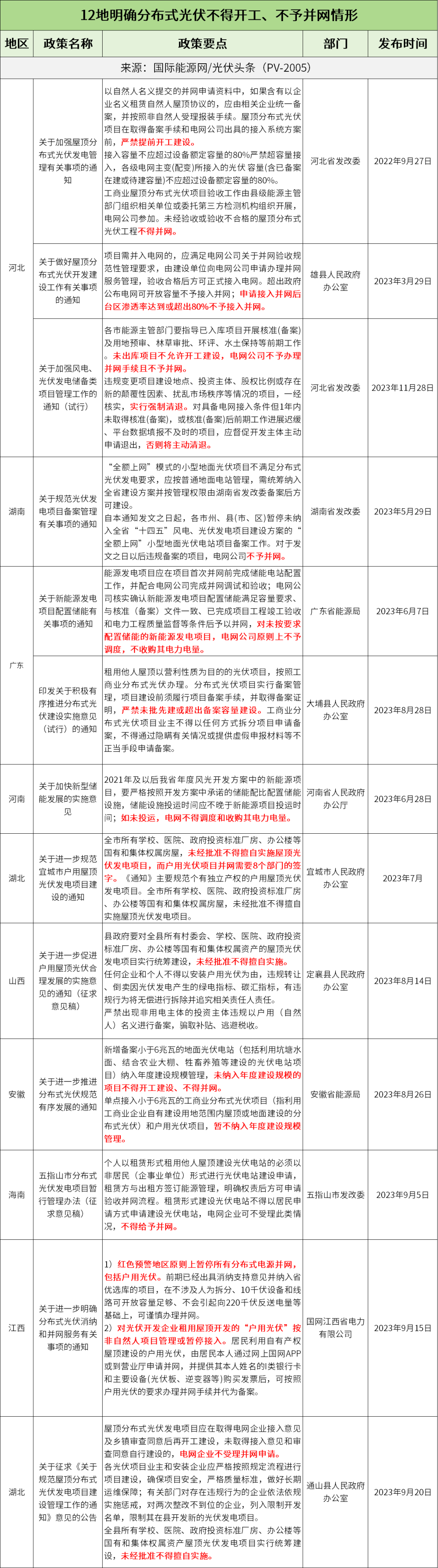 国际能源网(微信公众:inencom)统计发现:安徽、广东、广东大埔县、广东深圳龙华区、海南五指山市、河北、河北雄县、河南、河南焦作市苏家作乡、湖北、湖北京山市、湖北通山县、湖北宜城市、湖南、江苏睢宁县、江西、江西彭泽县、辽宁、辽宁沈阳市辽中区、辽宁营口市、山西定襄县21地出台相关政策规范分布式光伏市场,对不予并网、不得擅自开发、禁止安装、自行拆除、叫停备案等情形进行明确规定。