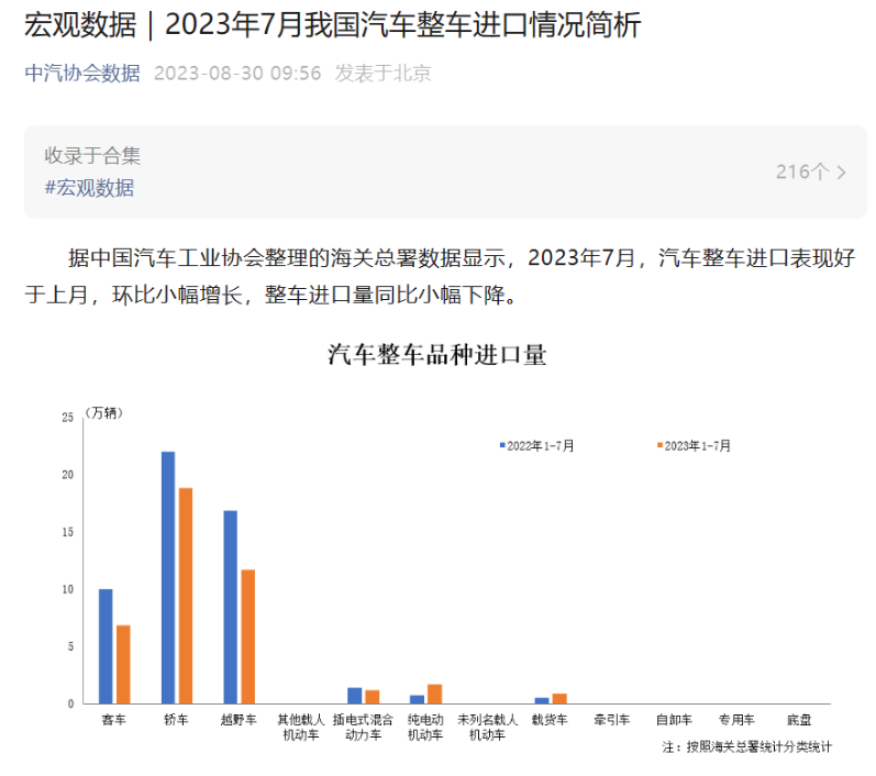 8月30日消息,据中国汽车工业协会整理的海关总署数据显示,2023年7月,汽车整车进口表现好于上月,环比小幅增长,整车进口量同比小幅下降。