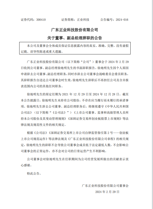 国际能源网获悉,近日,锂电设备企业正业科技发布公告称,公司于2月29日收到公司董事、副总经理徐地明先生的书面辞职报告。
