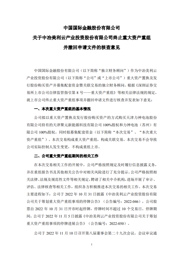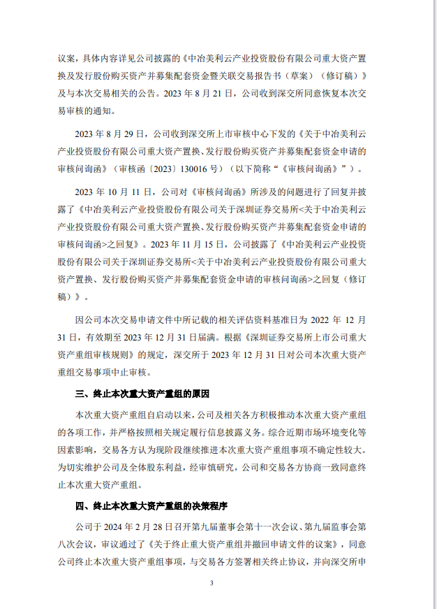 国际能源网获悉,2月28日,美利云发布公告称,董事会决定终止本次重大资产重组事项,与交易各方签署相关终止协议,并向深圳证券交易所申请撤回本次重大资产重组申请文件。