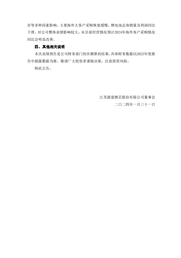 蔚蓝锂芯表示,2023年度,公司金属物流配送业务继续保持了良好的经营态势。LED芯片业务因为公司持续的产品结构升级及行业回暖,经营情况也在改善。对公司经营情况影响最大的是锂电池业务,公司锂电池业务之前长期以海外客户为主,2023年度,公司锂电池业务继续受到2022年下半年以来海外通胀、国际品牌工具去库存等多种因素影响,主要海外大客户采购恢复缓慢,锂电池总体销量及利润同比下滑,对公司整体业绩影响较大,从目前经营情况预计2024年海外客户采购情况同比会明显改善。