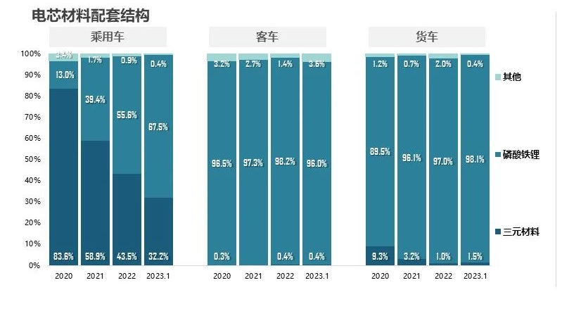 乘联会日前发布的《2023年1月新能源汽车三电系统洞察报告》显示,在乘用车市场,今年1月磷酸铁锂电芯的配套量占比大幅提升至67.5%,同比增加了23.8%,这是一个巨大的转变。