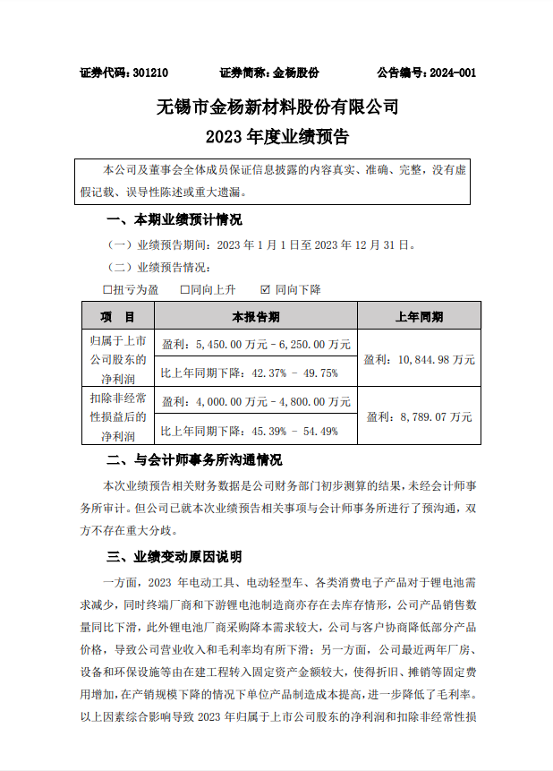 金杨股份表示,业绩变动主要原因是,一方面,2023年电动工具、电动轻型车、各类消费电子产品对于锂电池需求减少,同时终端厂商和下游锂电池制造商亦存在去库存情形,公司产品销售数量同比下滑,此外锂电池厂商采购降本需求较大,公司与客户协商降低部分产品价格,导致公司营业收入和毛利率均有所下滑。