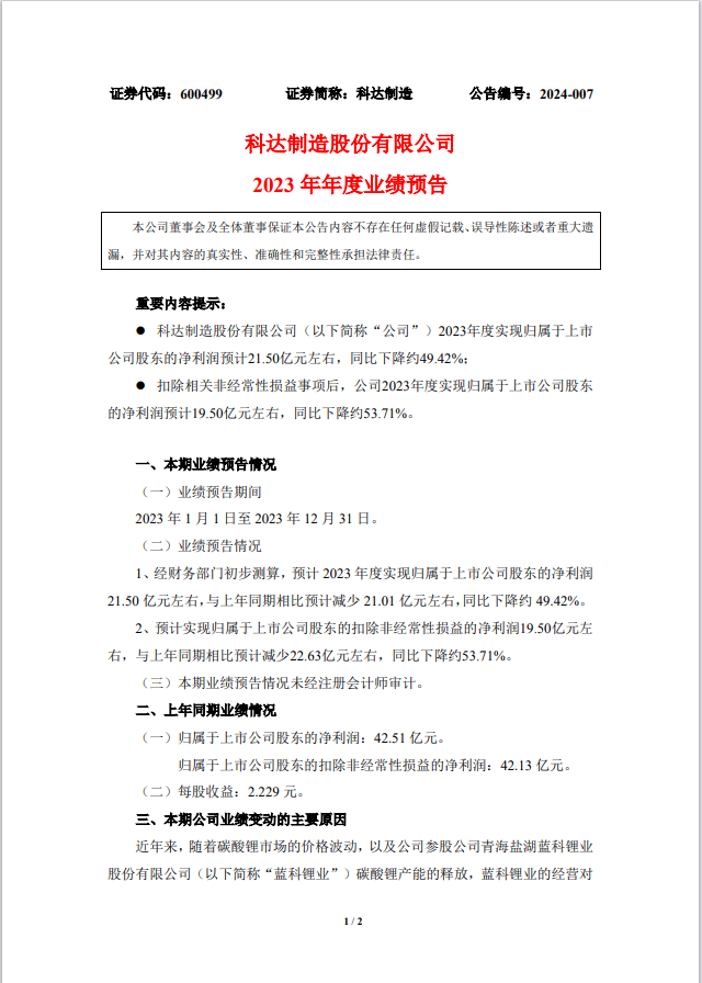 国际能源网获悉,近日,科达制造发布2023年年度业绩预告。
