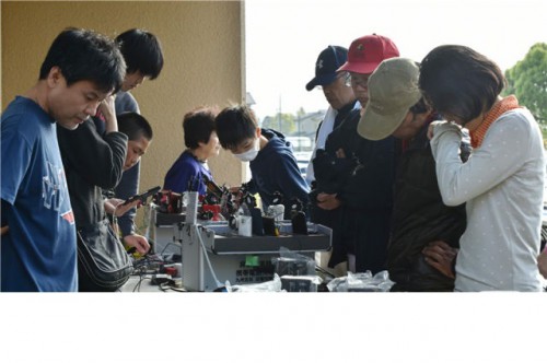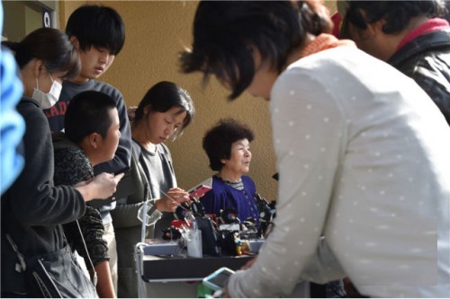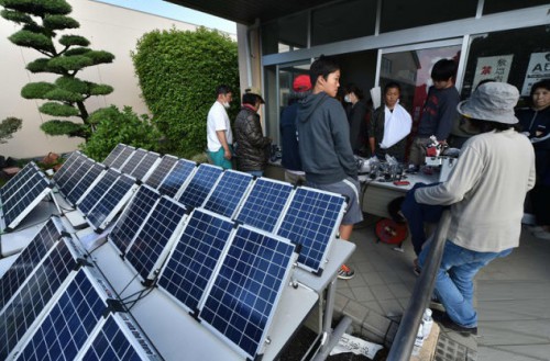 4月17日,在日本九州熊本县益城町的一处避难所里,受灾民众正在用应急太阳能充电板给手机充电。法新社照片