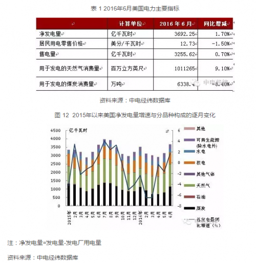 由于今年6月平均气温比去年同期略偏高,居民降温负荷增加,发电量恢复小幅增长。2016年6月,美国净发电量为3692亿千瓦时,同比增长1.7%。