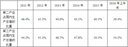 2016年上半年的数据经济数据显示,2016年上半年国内生产总值为达到340637亿元,同比增长6.7%。令人眼前一亮的数据是中国经济转型速度。2011年,第三产业占国内生产总值的比重在仅有44.2%,用了4年的时间到2015年占比才超过50%。但此次公布的数据显示今年上半年第三产业占国民生产总值达到了54.1%。而第二产业占国内生产总值的比重降到了39.4%,这是从过去20年以来第二产业占国内生产总值的比重首次降到了40%以下。