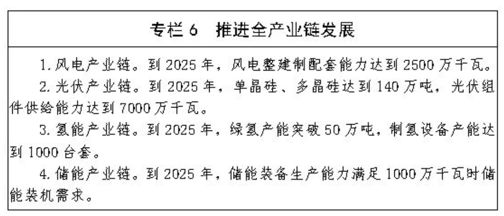 ——坚持全产业链发展,坚持链式思维,协同推进新能源开发利用与新能源装备制造产业发展,以风光氢储产业链为重点,深入实施延链补链强链行动和质量提升行动,支持区内大型风电、光伏发电企业与高精尖装备制造企业开展深度合作,推进装备制造产业集群建设。