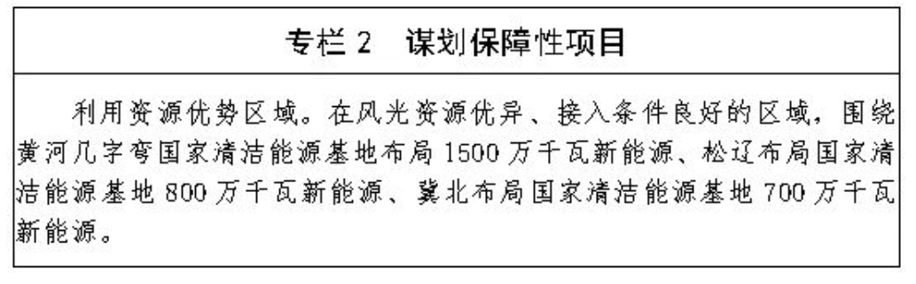 (二)科学有序谋划保障性项目。以沙漠、戈壁、荒漠地区为重点,在库布其、乌兰布和、腾格里沙漠等地区,鄂尔多斯等采煤沉陷区,科尔沁和浑善达克沙地布局一批百万千瓦级新能源基地,科学有序谋划新一批保障性新能源项目,到2025年谋划保障性新能源项目规模3000万千瓦以上。