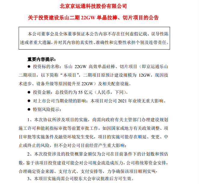京运通12月7日晚间发布公告,公司(简称“丙方”)在京运通乐山24GW单晶拉棒切方项目一期(12GW)项目有序开展的情况下,决定在四川省乐山市五通桥区建设实施二期项目,即乐山22GW高效单晶硅棒、切片项目(二期项目原预计建设规模为12GW,现因技术进步、设备升级等原因提升至22GW)及相关配套设施,总投资约为55亿元。