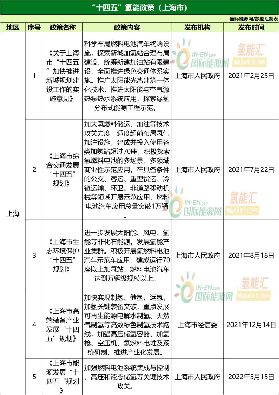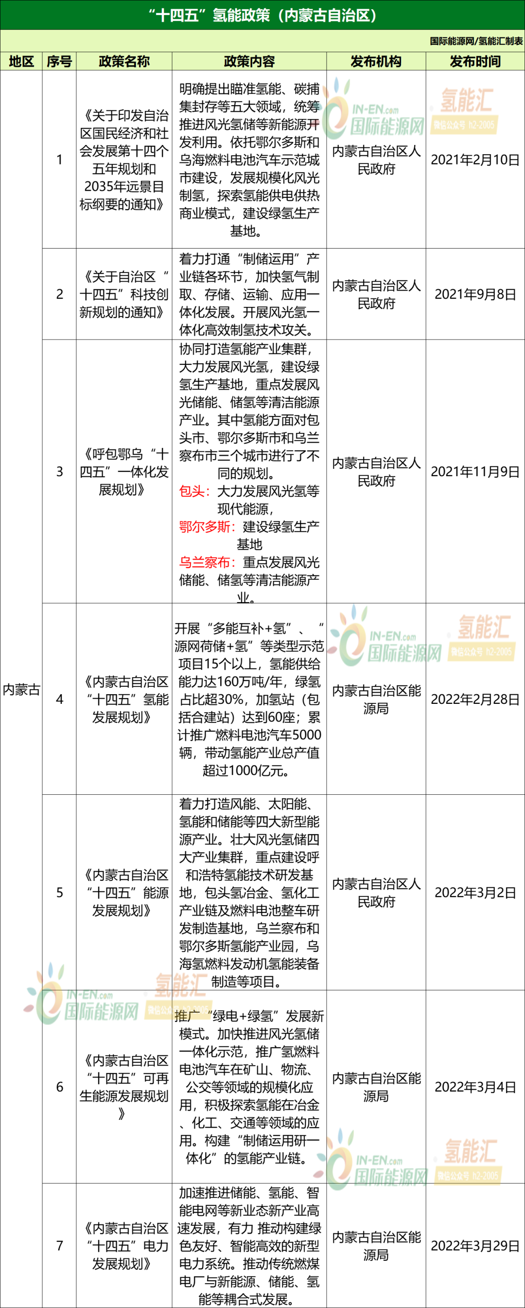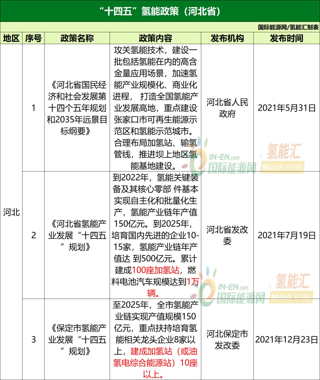 内蒙古自治区出台的“十四五”关于氢能的政策有7条,上海、广东等地也各自出台了5条相关政策。根据国际能源网/氢能汇(微信公众号:h2-2005)不完全统计,各地“十四五”规划政策提到的到2025年,全国计划建成加氢站超400座,推广氢燃料电池车车超23000辆。