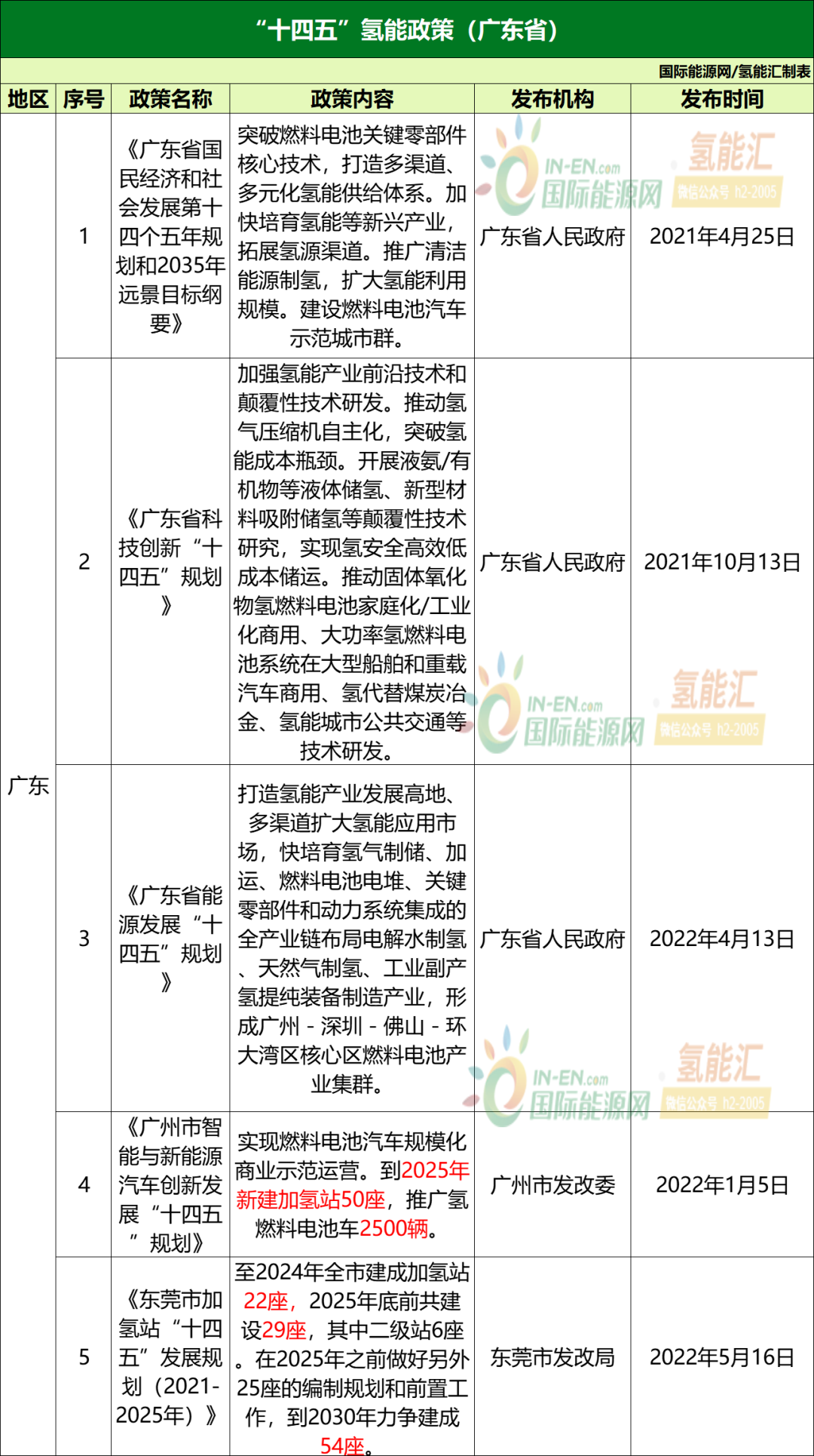 广东在氢燃料电池电堆等研发制造方面处于全国领先地位,在培育新能源汽车发展方面也有着得天独厚的发展优势。因此很多地级市的“十四五”规划也有非常明确的氢能发展目标。