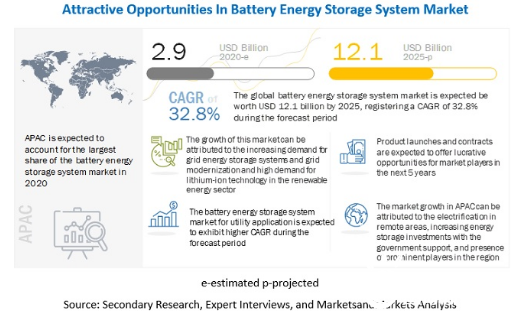 国际市场研究机构Markets and Markets日前发布的报告称,2020年全球电池储能系统市场规模预计将达到29亿美元,到2025年,这一数据有望增至121亿美元,期间年复合增长率达到32.8%。