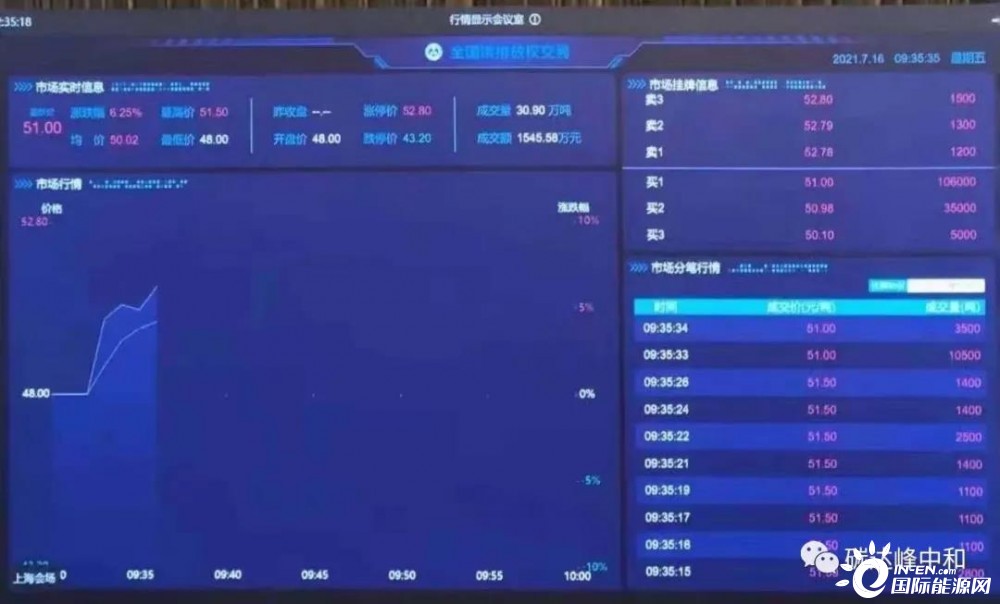 今天上午9点30分,全国碳排放权交易在上海环境能源交易所正式启动。9点30分,首笔全国碳交易已经撮合成功,价格为每吨52.78元,总共成交16万吨,交易额为790万元。