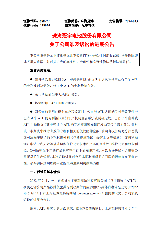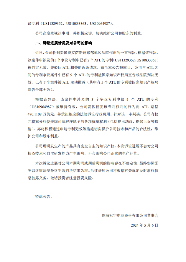 根据该判决,该案件中涉及的3个争议专利中仅1个ATL的专利(US10964987)被维持有效,珠海冠宇需因侵犯该专利权利的行为向ATL赔偿470.1108万美元,并承担相应的法院诉讼行政费用。针对该一审判决,公司有权并将充分行使美国司法程序赋予的各项抗辩权利(包括提出动议,提起上诉等措施),亦将积极通过申请专利无效等措施切实保护公司技术和产品的合法性,维护公司和股东利益。