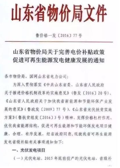 国际能源网讯: 近日,山东省物价局下发《山东省物价局关于完善电价补贴政策促进可再生能源发电健康发展的通知》鲁价格一发2016【77号】文件。通知指出,为支持可再生能源发展。2015年前投产的光伏电站、风电,在国家标杆电价基础上继续执行省级补贴。
