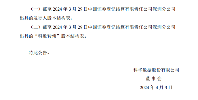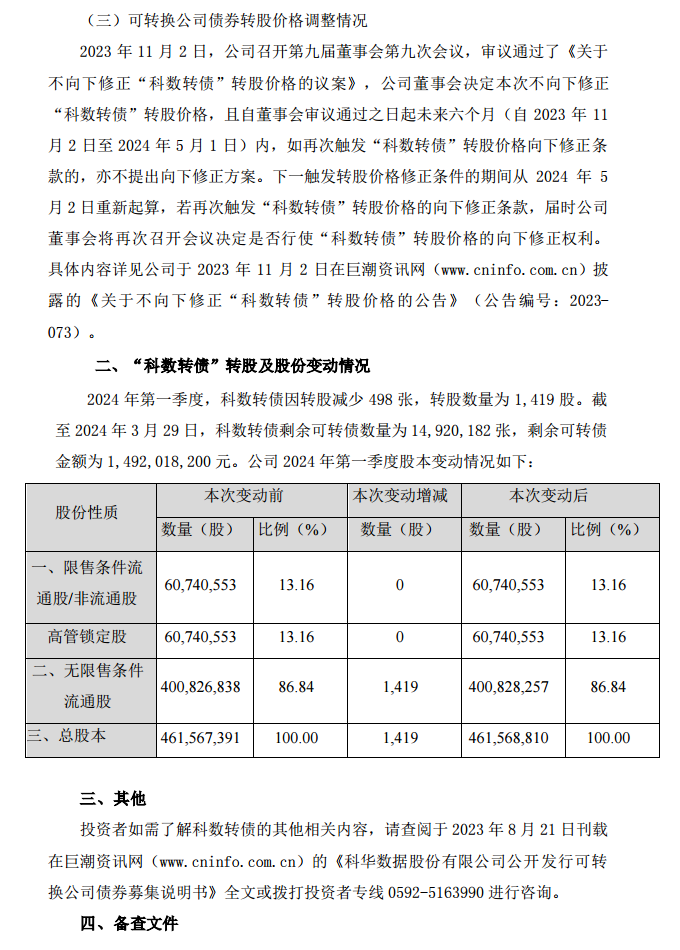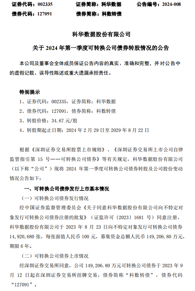 公告称,2024年第一季度,科数转债因转股减少498张,转股数量为1,419股。截至2024年3月29日,科数转债剩余可转债数量为14,920,182张,剩余可转债金额为1,492,018,200元。