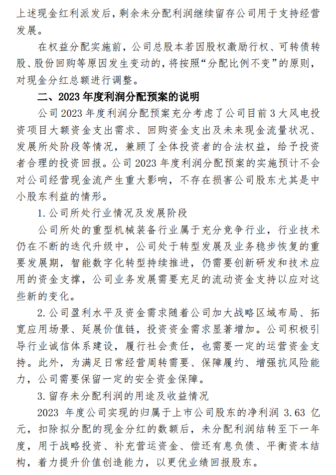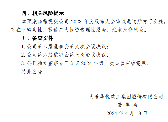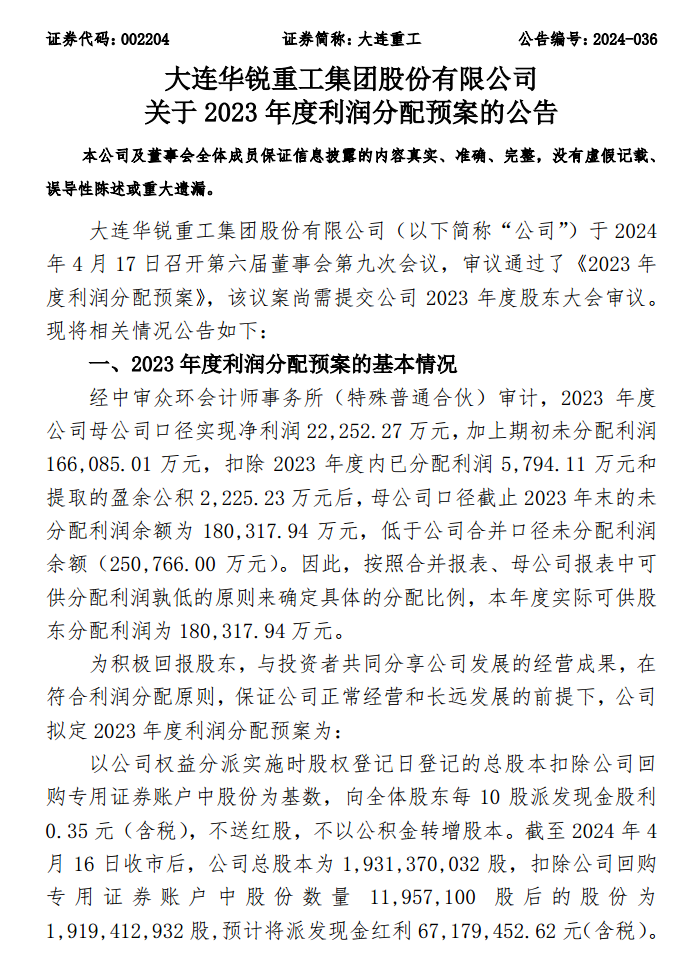 国际能源网获悉,近日,大连重工发布2023年度利润分配预案的公告。
