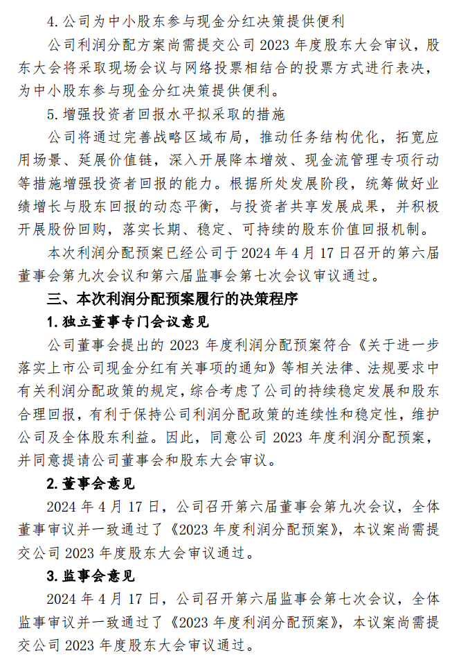 为积极回报股东,与投资者共同分享公司发展的经营成果,在符合利润分配原则,保证公司正常经营和长远发展的前提下,公司拟定 2023 年度利润分配预案为:以公司权益分派实施时股权登记日登记的总股本扣除公司回购专用证券账户中股份为基数,向全体股东每 10 股派发现金股利0.35 元(含税),不送红股,不以公积金转增股本。截至 2024 年 4月 16 日收市后,公司总股本为 1,931,370,032 股,扣除公司回购专 用 证 券 账 户 中 股 份 数 量 11,957,100 股 后 的 股 份 为1,919,412,932 股,预计将派发现金红利 67,179,452.62 元(含税)。