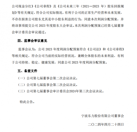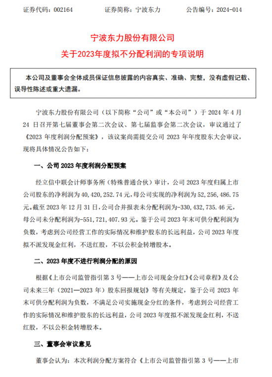 国际能源网获悉,近日,宁波东力发布公告称,公司2023年度归属上市公司股东的净利润为40,420,252.74元,母公司实现的净利润为52,256,486.75元。截至2023年12月31日,公司合并报表未分配利润为-330,432,735.46元,母公司未分配利润为-551,721,407.93元。鉴于公司2023年末可供分配利润为负数,考虑到公司经营工作的实际情况和维护股东的长远利益,公司2023年度拟不派发现金红利,不送红股,不以公积金转增股本。