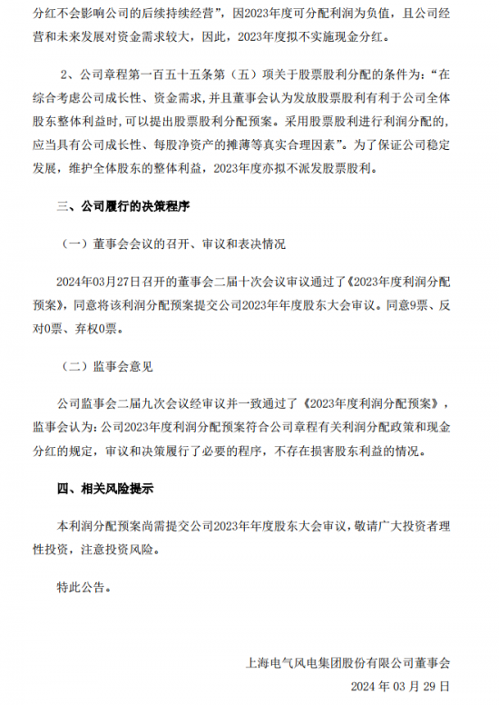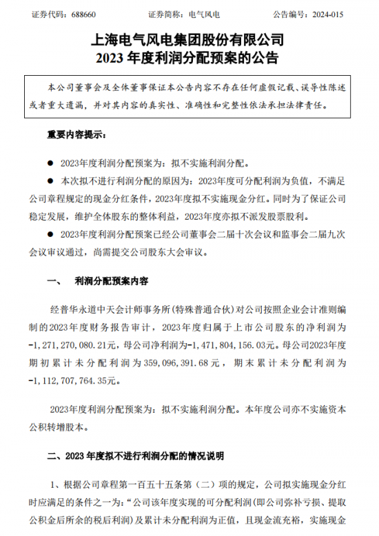 国际能源网获悉,近日,电气风电发布2023年度利润分配预案的公告。2023 年 度 归属 于 上 市 公 司 股 东 的净 利 润 为-1,271,270,080.21元,母公司净利润为-1,471,804,156.03元。母公司2023年度期 初 累 计 未 分 配 利 润 为 359,096,391.68 元 , 期 末 累 计 未 分 配 利 润 为-1,112,707,764.35元。