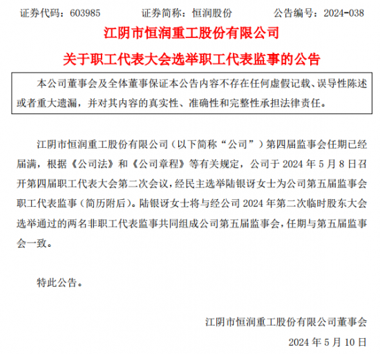 公告称,江阴市恒润重工股份有限公司(简称“恒润股份”)第四届监事会任期已经届满,根据有关规定,公司于2024年5月8日召开第四届职工代表大会第二次会议,经民主选举陆银讶女士为公司第五届监事会职工代表监事。