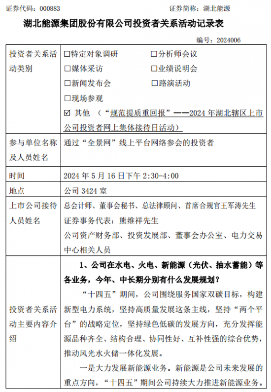 国际能源网获悉,5月17日,湖北能源发布投资者关系活动记录表。