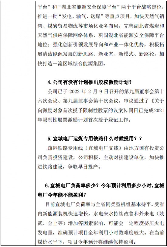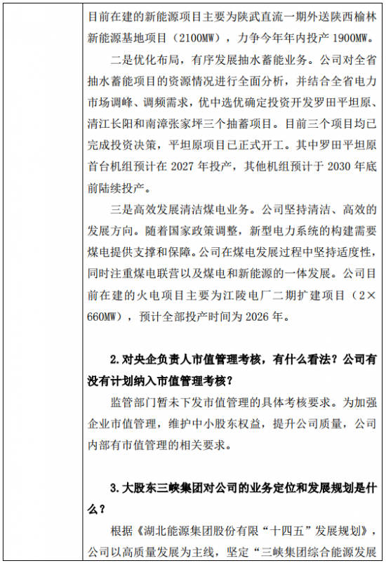 湖北能源针对公司在水电、火电、新能源(光伏、抽水蓄能)等各业务,今年、中长期发展规划问题上做出回答。