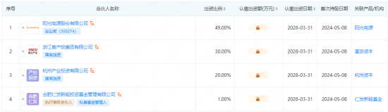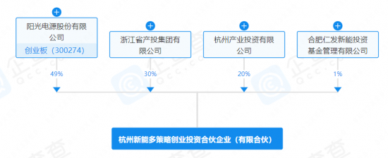 企查查股权穿透图显示,杭州新能多策略创业投资合伙企业(有限合伙)由阳光电源、浙江省产投集团有限公司、杭州产业投资有限公司、合肥仁发新能投资基金管理有限公司共同出资。
