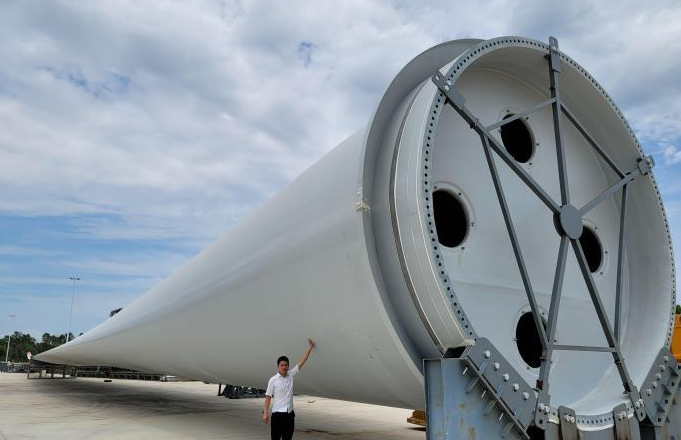 走进明阳智慧能源集团股份公司海南东方智能制造基地(下称“明阳东方基地”),143米长的叶片如躺卧在地的巨龙。基地副总经理兼叶片厂厂长梁利清介绍,该叶片代号为MySE292,是海上风力发电机的超大型叶片,292代表叶片配套的风轮直径为292米,意味着该叶片扫风面积超6.6万平方米,相当于9.4个标准足球场大小。