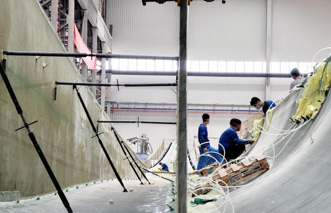 5月29日,记者探访明阳集团东方智能制造基地。图为工人们正在制作海上风机叶片。 中新社记者 王晓斌 摄