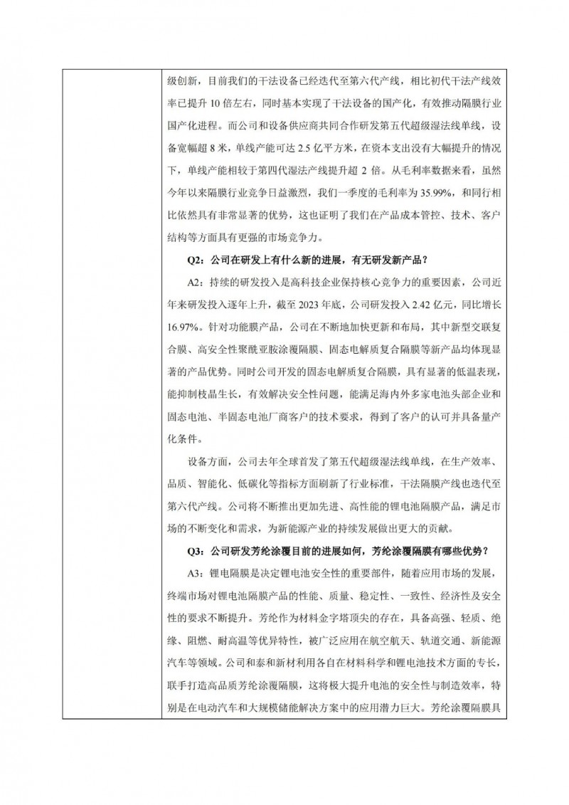 星源材质表示,持续的研发投入是高科技企业保持核心竞争力的重要因素,公司近年来研发投入逐年上升,截至2023年底,公司研发投入2.42亿元,同比增长16.97%。针对功能膜产品,公司在不断地加快更新和布局,其中新型交联复合膜、高安全性聚酰亚胺涂覆隔膜、固态电解质复合隔膜等新产品均体现显著的产品优势。同时公司开发的固态电解质复合隔膜,具有显著的低温表现,能抑制枝晶生长,有效解决安全性问题,能满足海内外多家电池头部企业和固态电池、半固态电池厂商客户的技术要求,得到了客户的认可并具备量产化条件。