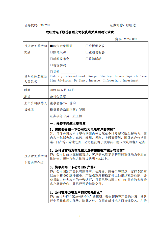 国际能源网获悉,近日,欣旺达接受调研。
