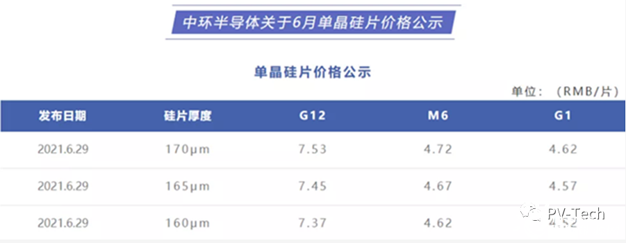 相比之下,另外一家硅片供应商隆基股份(601012)6月24日也公示了最新价格,170μm厚度M10报价为5.87元/片,M6为4.89元/片,G1为4.79元/片。隆基最新报价与5月25日的报价持平,在M6、G1两种硅片价格方面,中环相比隆基低0.17元/片。