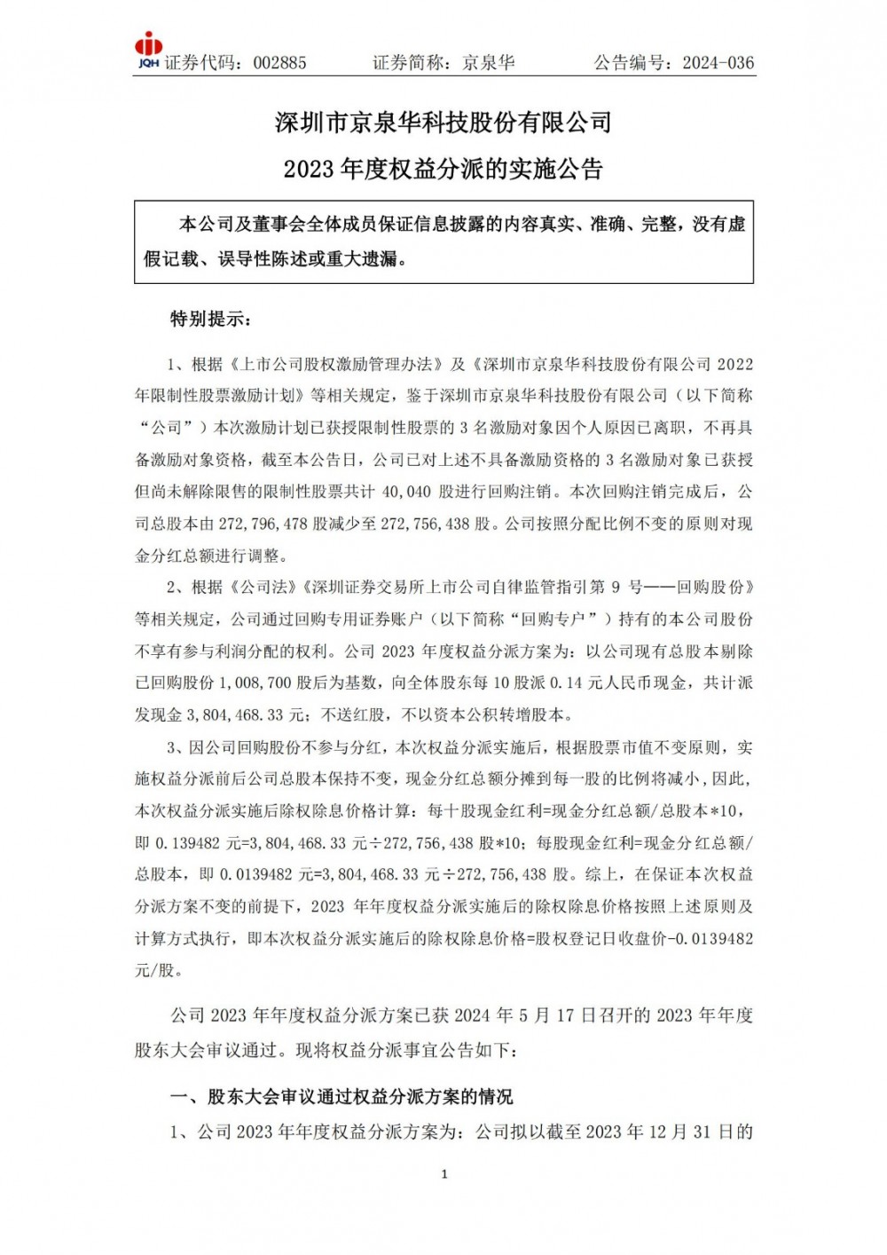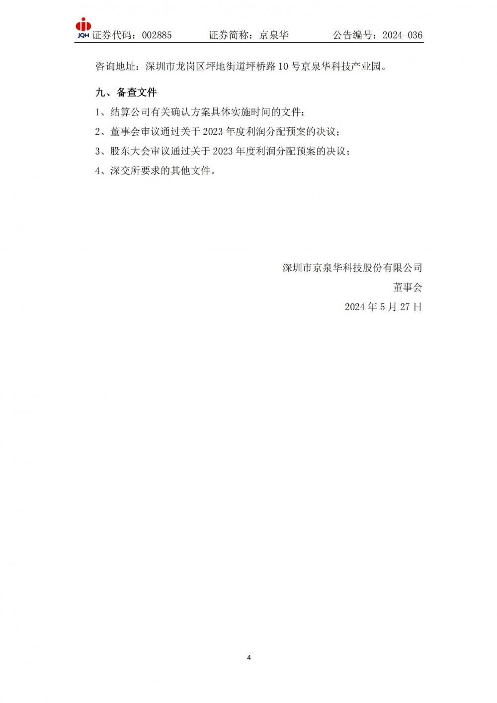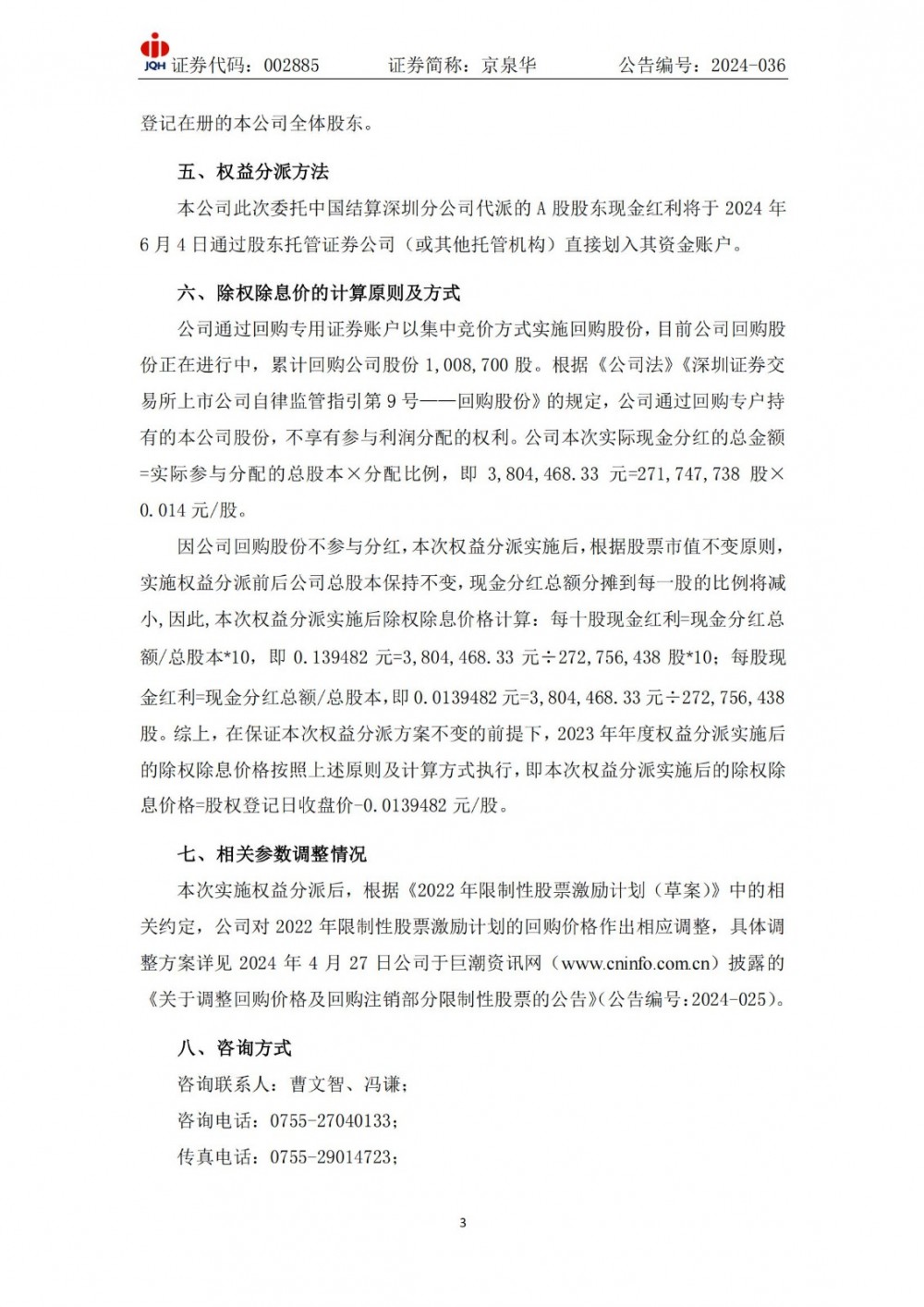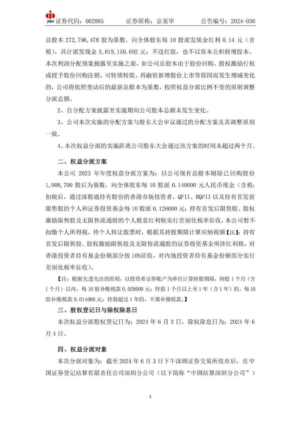 国际能源网获悉,5月28日,京泉华发布2023年度权益分派的实施公告。