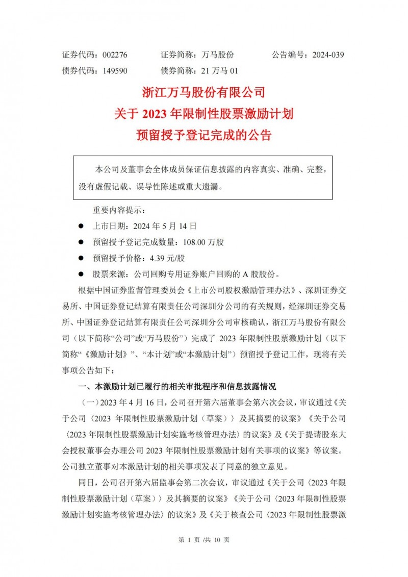 国际能源网获悉,5月15日,万马股份发布关于2023年限制性股票激励计划预留授予登记完成的公告。
