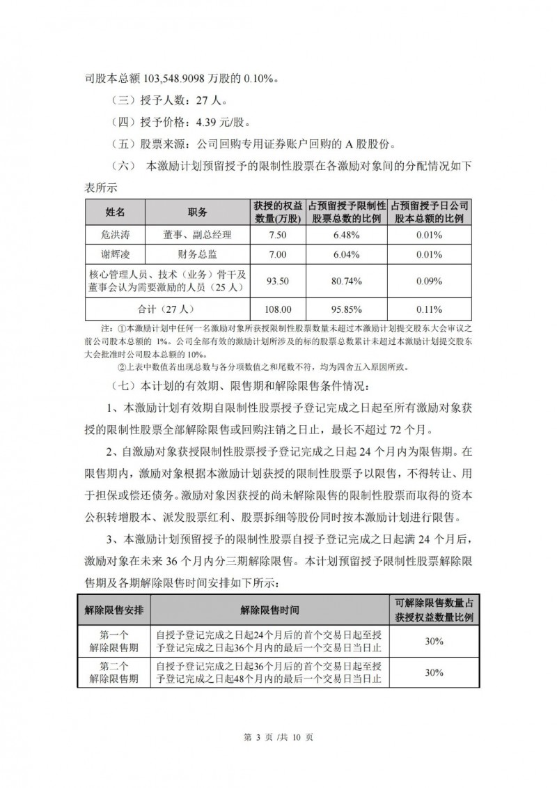 公告称,本次预留授予登记完成数量108.00 万股,约占本激励计划草案公告时公司股本总额 103,548.9098 万股的 0.10%。授予人数27 人,授予价格4.39 元/股。