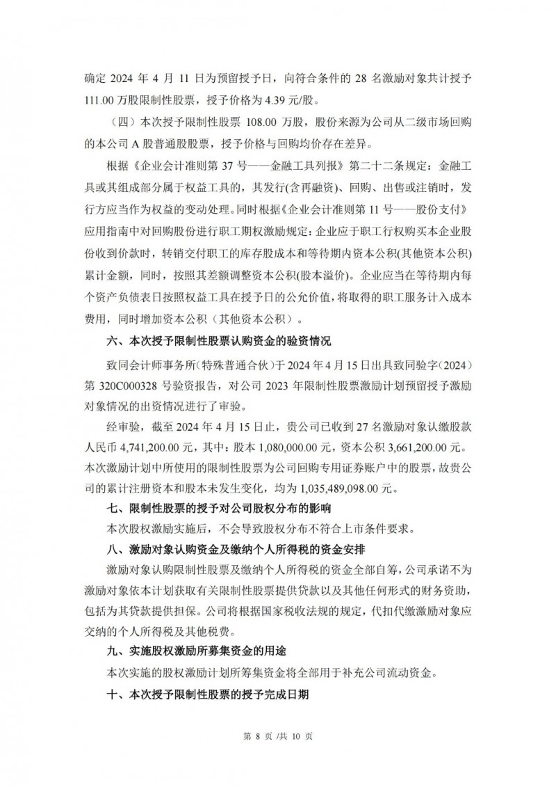经审验,截至2024年4月15日止,贵公司已收到27名激励对象认缴股款人民币4,741,200.00元,其中:股本1,080,000.00元,资本公积3,661,200.00元。本次激励计划中所使用的限制性股票为公司回购专用证券账户中的股票,故贵公司的累计注册资本和股本未发生变化,均为1,035,489,098.00元。