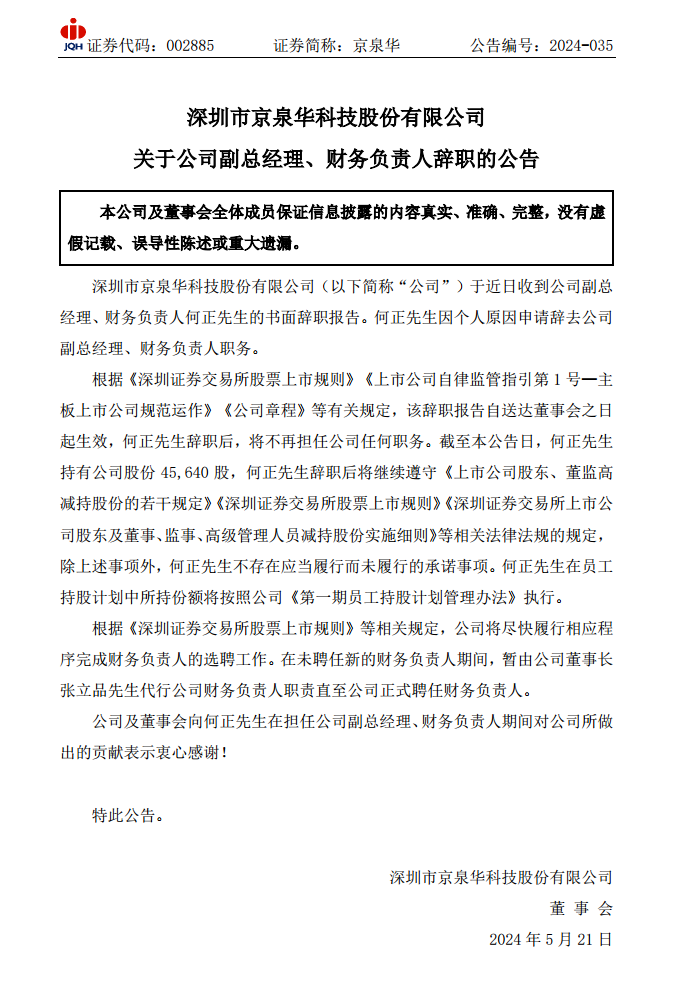 国际能源网获悉,5月21日,京泉华发布关于公司副总经理、财务负责人辞职的公告。 公告称,公司于近日收到公司副总经理、财务负责人何正先生的书面辞职报告。何正先生因个人原因申请辞去公司副总经理、财务负责人职务。 详情如下: