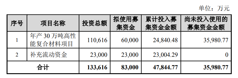 2022年,会通股份通过可转债发行,募资8.3亿元,其中6亿元用于年产30万吨高性能复合材料项目。截止公告日,累计投入募集资金金额2.48亿元。