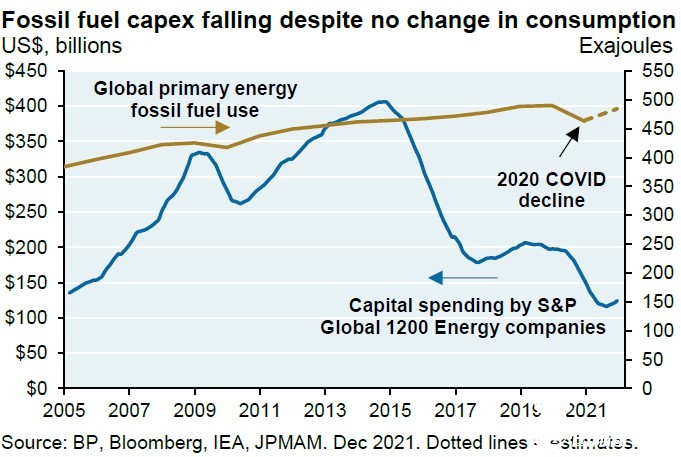 即使在俄乌冲突升级之前,能源价格同样居高难下,高于2015年至2021年的任何时期。而这可能表明,2022年燃料成本飙升可能是气候变化之外的其他因素造成的,除经济复苏以及地缘政治因素导致供应跟不上需求,还包括IEA建议的反对对化石燃料进行大规模投资。如下图所示,全球化石燃料消耗量在不断增加,但对于化石燃料的资本支出却在不断下滑。