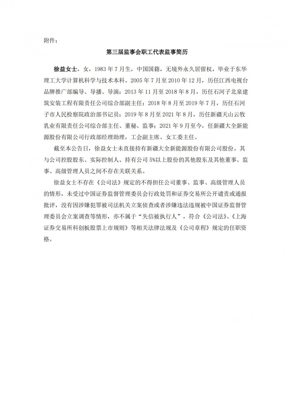 徐益女士,女,1983年7月生,中国国籍,无境外永久居留权,毕业于东华理工大学计算机科学与技术本科。2005年7至2010年12月,历任江西电视台品牌推广部编导、导播、导演;2013年11月至2018年8月,历任石河子北泉建筑安装工程有限责任公司综合部副主任;2018年8月至2019年7月,历任石河子市人民检察院政治部书记员;2019年8月至2021年8月,历任新疆天山云牧乳业有限责任公司综合部主任、董秘、监事;2021年9月至今,任新疆大全新能源股份有限公司行政部经理助理,工会副主席、女工委主任。