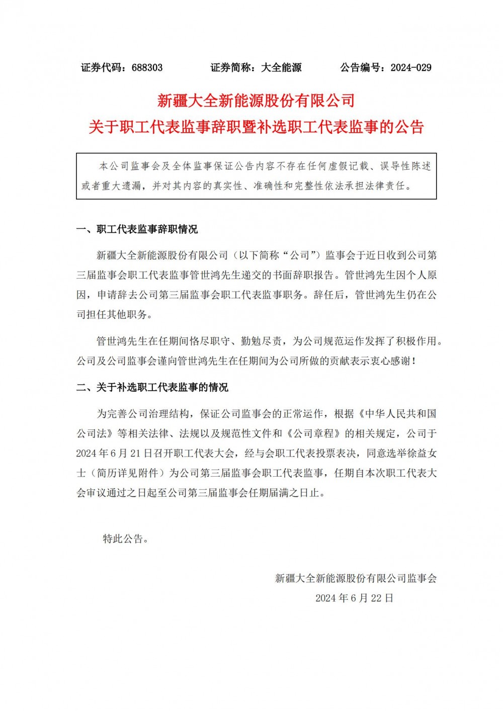 公告表示,新疆大全新能源股份有限公司(以下简称“公司”)监事会于近日收到公司第三届监事会职工代表监事管世鸿先生递交的书面辞职报告。管世鸿先生因个人原因,申请辞去公司第三届监事会职工代表监事职务。辞任后,管世鸿先生仍在公司担任其他职务。
