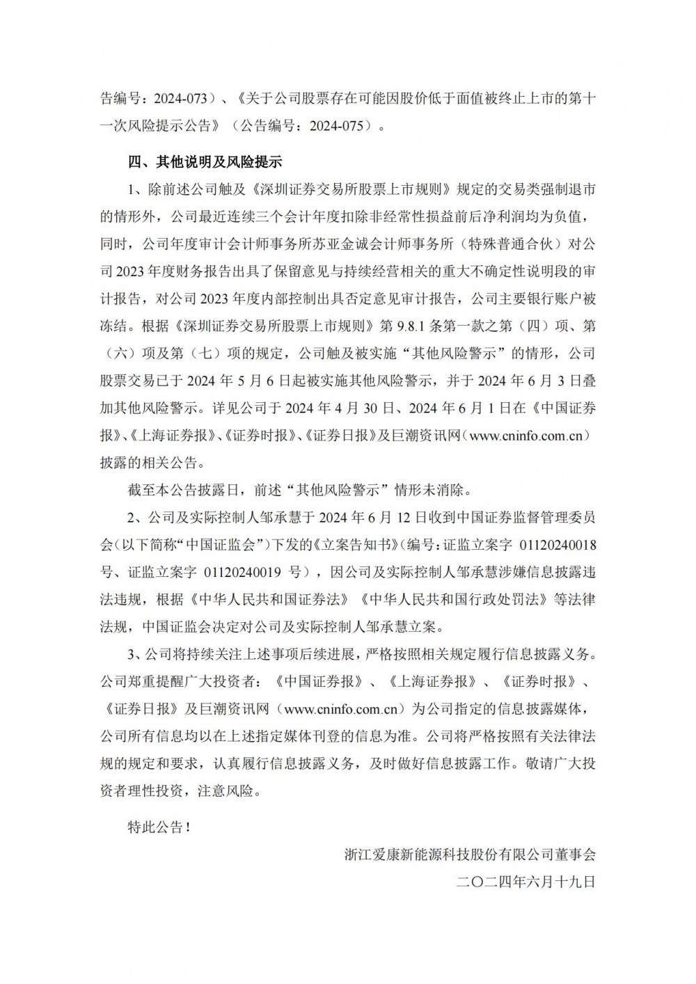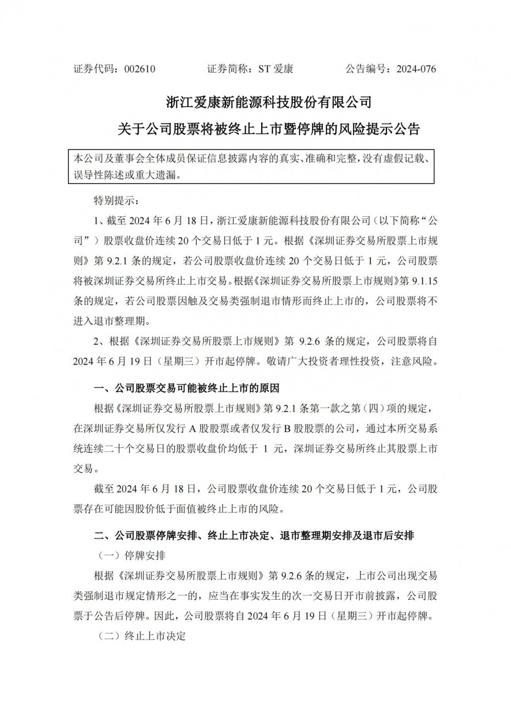 公告表示,截至2024年6月18日,浙江爱康新能源科技股份有限公司(以下简称“公司”)股票收盘价连续20个交易日低于1元。根据《深圳证券交易所股票上市规则》第9.2.1条的规定,若公司股票收盘价连续20个交易日低于1元,公司股票将被深圳证券交易所终止上市交易。根据《深圳证券交易所股票上市规则》第9.1.15条的规定,若公司股票因触及交易类强制退市情形而终止上市的,公司股票将不进入退市整理期。